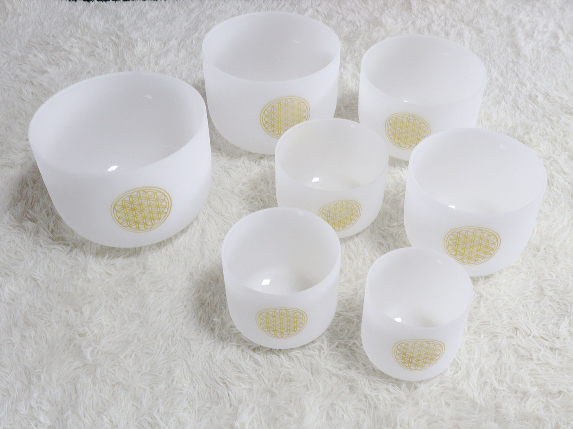 This pristine set of singing bowls measures 6-14 inches and the beautiful Flower of Life design complements this unique instrument and represents the sound waves produced by this crystal bowl. These are newly crafted crystal singing bowls that are beautifully crafted for a powerful sound. Our crystal singing bowls are made from pure quartz crystal powder heated to thousands of degrees. During the heating process, the individual particles of the quartz powder fuse together to form a bowl. They are then individually tuned to a specific note. The size of the bowl affects the pitch: smaller bowls produce much higher pitches than larger bowls. In general, higher pitches have an uplifting, purifying effect, while lower pitches tend to be more relaxing and grounding. We respond differently to specific sounds, so the same bowl can affect individuals quite differently. Our recommendation is to purchase different types of mallets and learn about their individual sounds, such as rubber, leather, felt, or wool mallets.